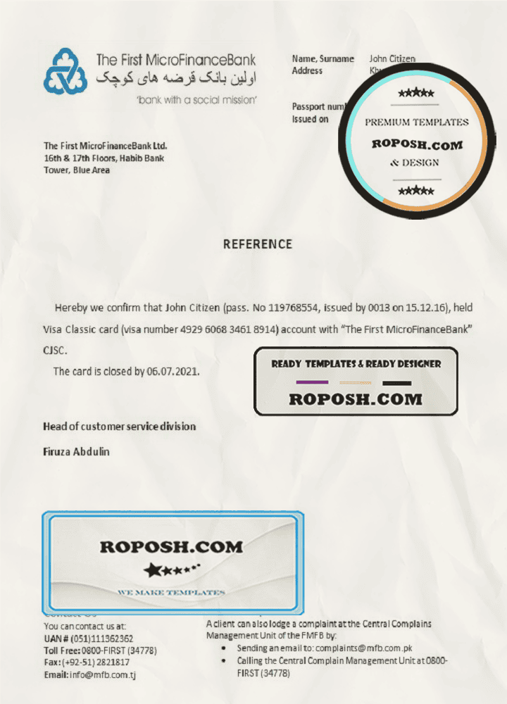 Tajikistan The First MicroFinanceBank account closure reference letter template in Word and PDF format