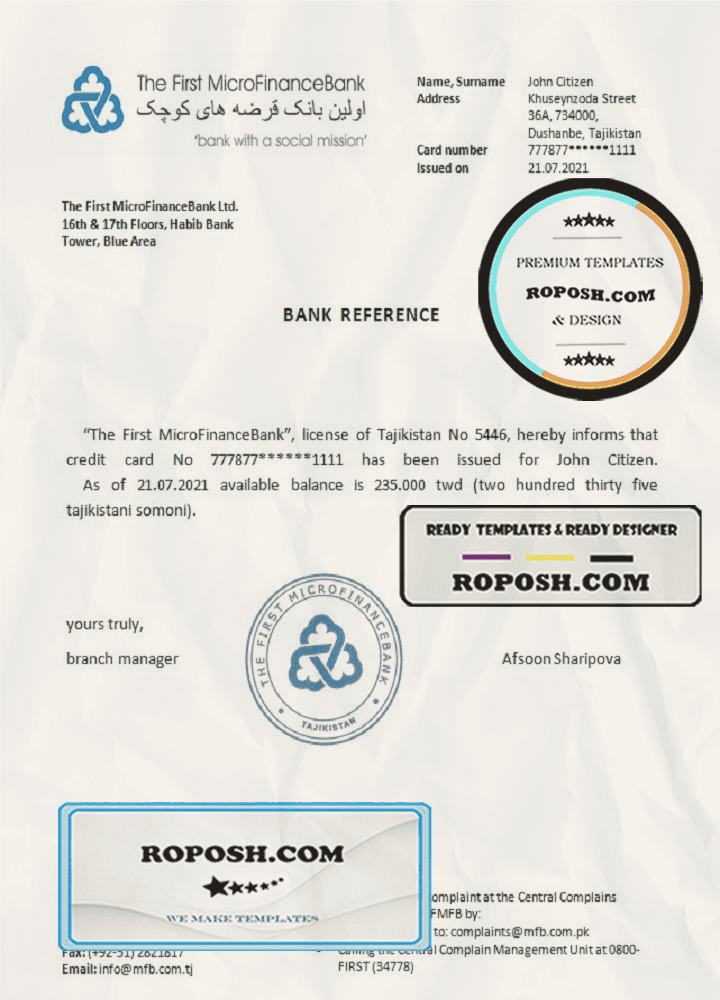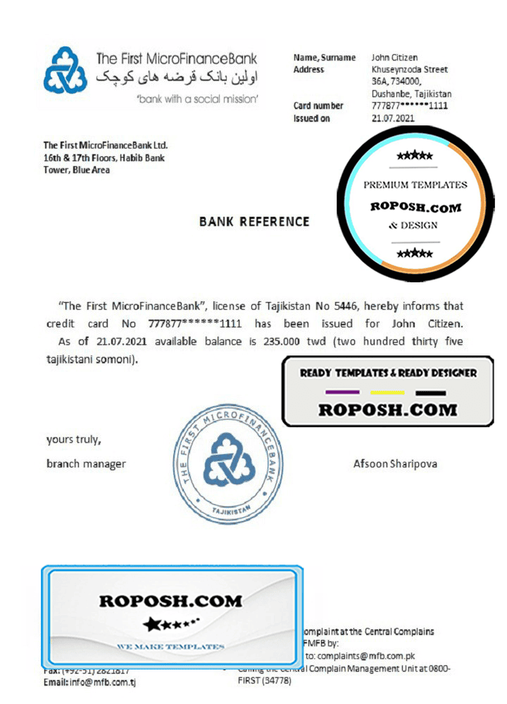 Tajikistan The First MicroFinanceBank reference account reference letter template in Word and PDF format