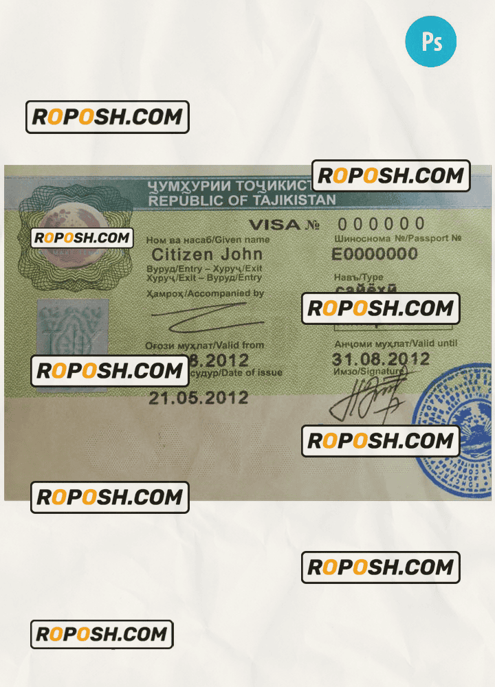 Tajikistan travel visa template psd. Buy Customizable Travel Visa Template with high quality and enjoy its unique features such as easy to customize, Layer based, fonts included sample. you can edit this template and put any name, address, license number, Id number, birth date, height, weight, expire date, change photos etc. This Photoshop template is a layer based psd file and it’s easy to Editing.To modify this photoshop template file you will need a Photo editing software such as Adobe Photoshop No need to be expert on editing software like adobe Photoshop. However, You just have to basic knowledge on adobe photoshop, to edit this template. Never used low quality template. Your account may be suspended. Also, if you’re looking for an editable SSN template, Roposh is by your side so you can get it easily and even for free.