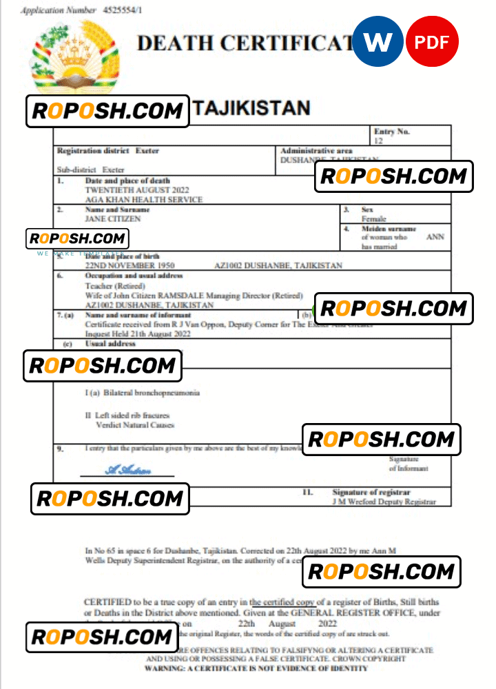 Explore a vast collection of legitimate-looking editable death certificates for several countries worldwide. The editable Tajikistan death certificates offers easy access to obtaining the required document for a variety of purposes, predominantly claiming life insurance, pensions, and resolving estates.