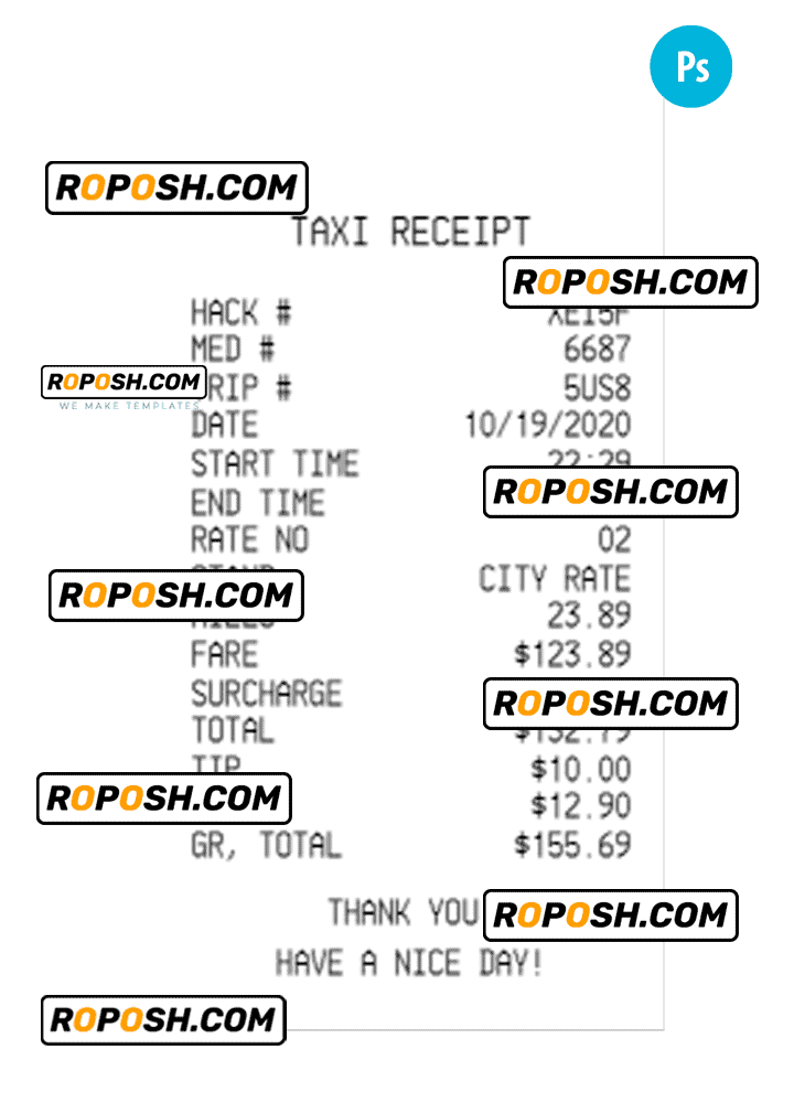 A TAXI payment receipt in psd format is a document that can prove a successful transaction. It includes the purchase details such as the date of the transaction, the amount paid, a description of goods or services purchased, and a unique receipt number.