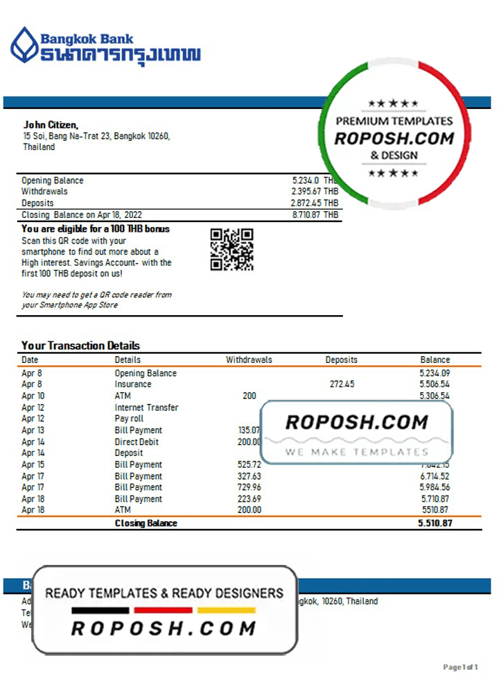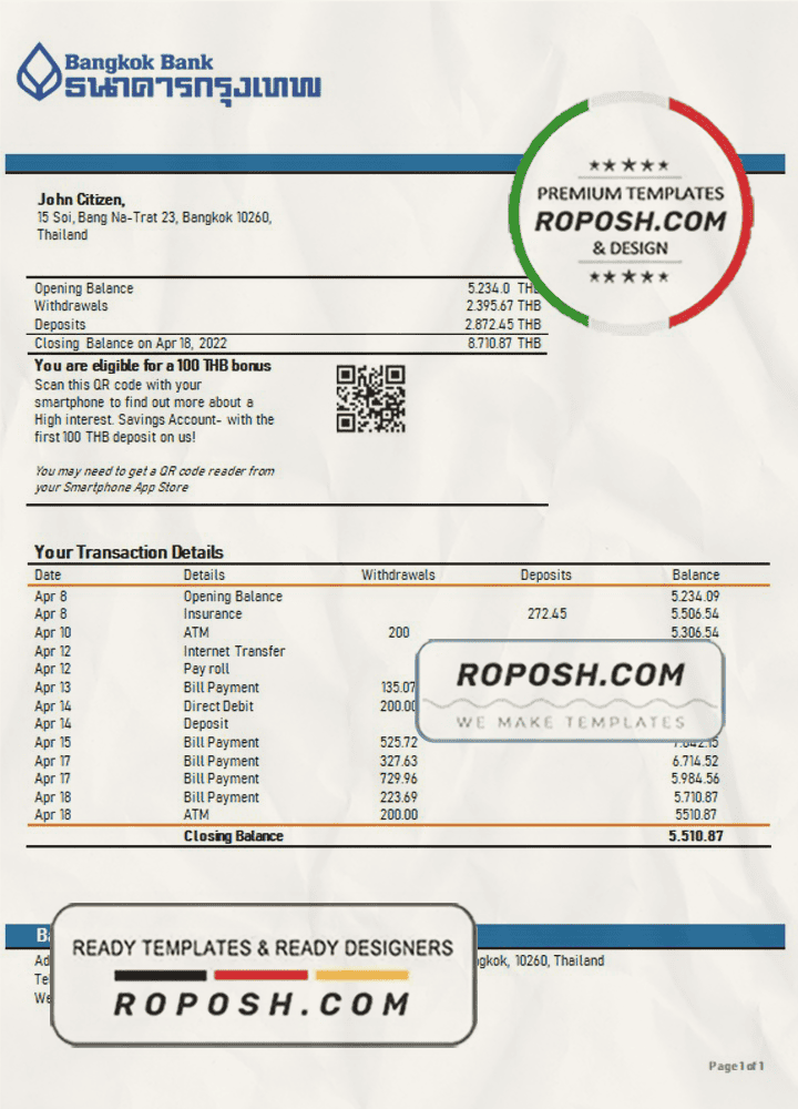 Grab now fully editable Thailand Bangkok Bank statement Word Template from our website Roposh and put your own info to create Realistic Bank Statement Word template and ready your own novelty documents. It’ll be so beneficial if your Bank Statement is expired, stolen or not available.We also have editable credit card, ID Card psd template, Bank Statement psd template, drivers license psd template & printable editable blank utility bill template.