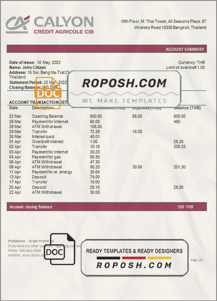 Thailand Caylon Bank statement Word and Pdf Template use for :