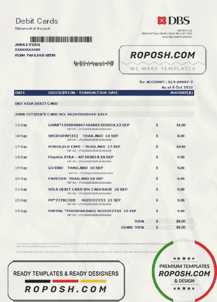 Grab now fully editable Thailand DBS bank statement easy to fill Excel Template from our website Roposh and put your own info to create Realistic Bank Statement template Excel and ready your own novelty documents. It’ll be so beneficial if your Bank Statement is expired, stolen or not available.We also have editable credit card, ID Card psd template, Bank Statement psd template, drivers license psd template & printable editable blank utility bill template.