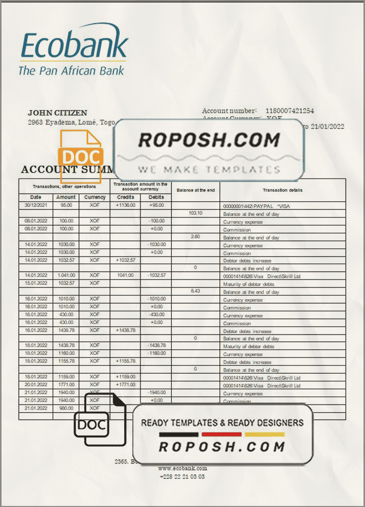 Grab now fully editable Togo Ecobank Bank statement Word Template from our website Roposh and put your own info to create Realistic Bank Statement Word template and ready your own novelty documents. It’ll be so beneficial if your Bank Statement is expired, stolen or not available.We also have editable credit card, ID Card psd template, Bank Statement psd template, drivers license psd template & printable editable blank utility bill template.