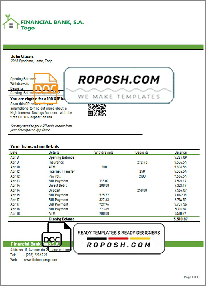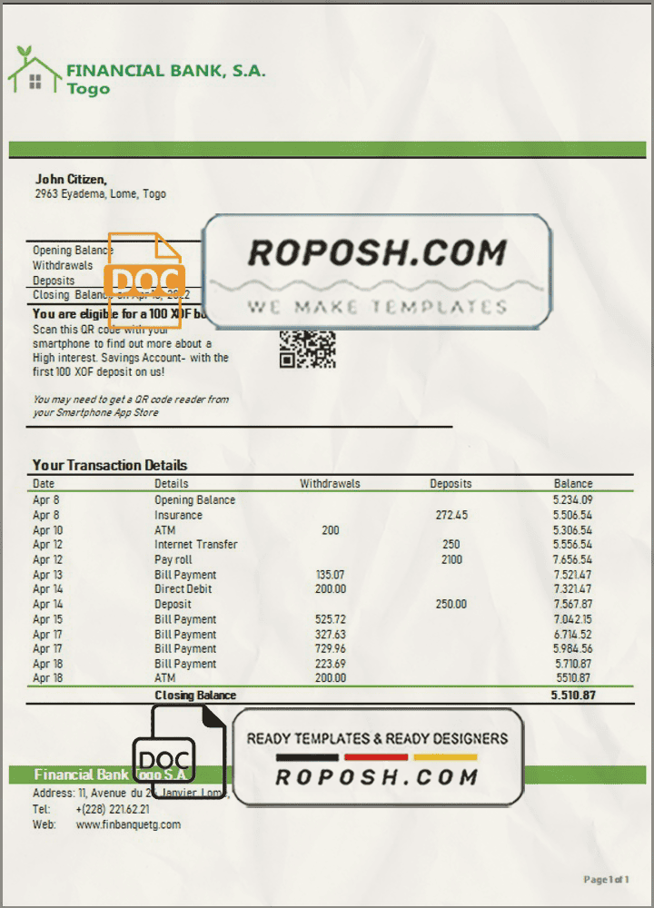 Get your fully editable Togo Financial Bank Statement Word Template from Roposh and customize it with your own information to create a realistic bank statement. This is especially useful if your bank statement is expired, stolen, or unavailable. We also offer editable credit card templates, ID card PSD templates, bank statement PSD templates, driver’s license PSD templates, and printable editable blank utility bill templates.