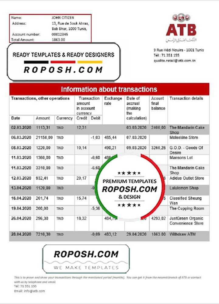 Grab now fully editable Tunisia ATB bank proof of address statement Word Template from our website Roposh and put your own info to create Realistic Bank Statement Word template and ready your own novelty documents. It’ll be so beneficial if your Bank Statement is expired, stolen or not available.We also have editable credit card, ID Card psd template, Bank Statement psd template, drivers license psd template & printable editable blank utility bill template.