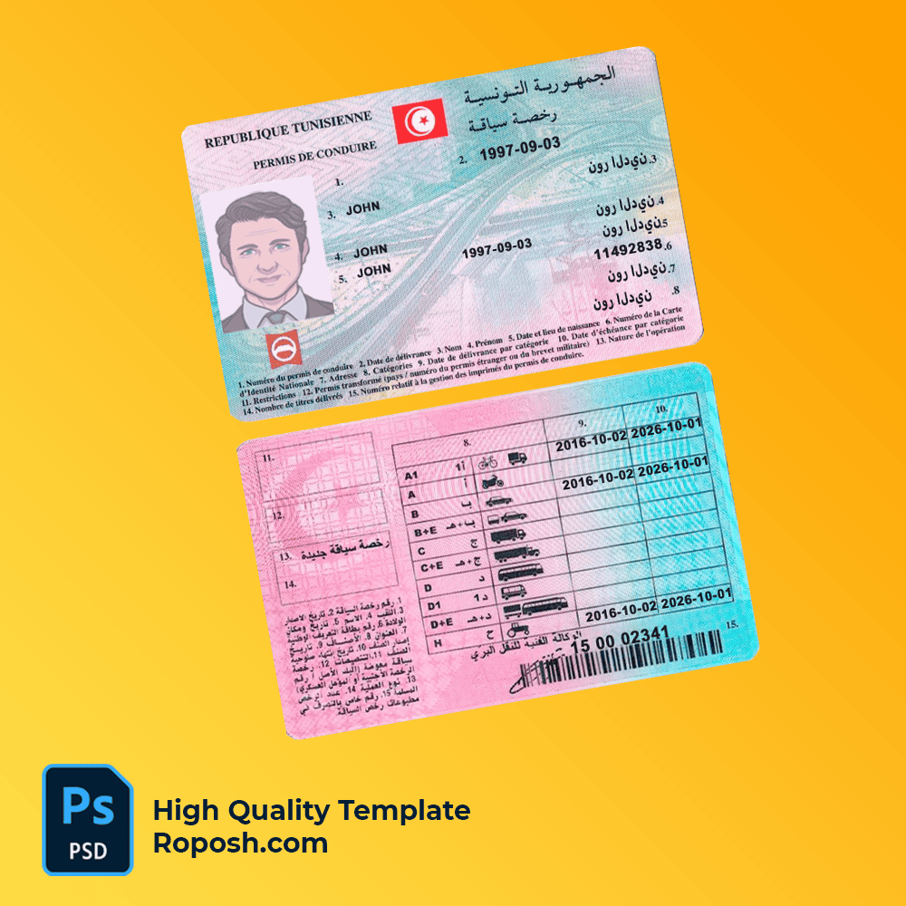Whether you need a PSD template for personal use, design projects, or educational purposes, our Tunisia driver license PSD template is the perfect choice. Visit roposh.com today to place your order and get started!