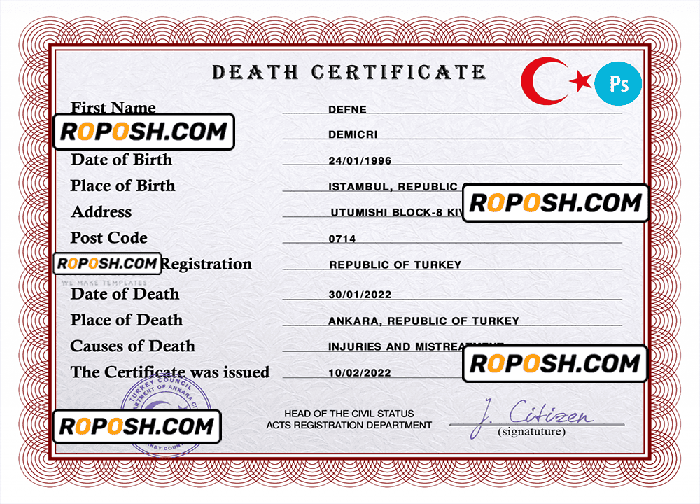 Explore a vast collection of legitimate-looking editable death certificates for several countries worldwide. The editable Turkey death certificates offers easy access to obtaining the required document for a variety of purposes, predominantly claiming life insurance, pensions, and resolving estates.
