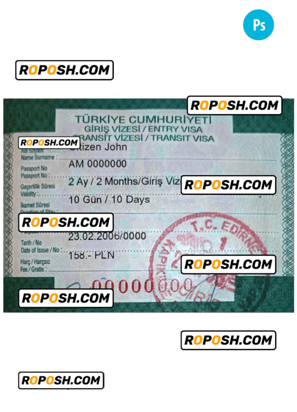 TURKEY entry visa template psd. Buy Customizable Travel Visa Template with high quality and enjoy its unique features such as easy to customize, Layer based, fonts included sample. you can edit this template and  put any name, address, license number, Id number, birth date, height, weight, expire date, change photos etc. This Photoshop template is a layer based psd file and it’s easy to Editing.To modify this photoshop template file you will need a Photo editing software such as Adobe Photoshop No need to be expert on editing software like adobe Photoshop. However, You just have to basic knowledge on adobe photoshop, to edit this template. Never used low quality template. Your account may be suspended. Also, if you’re looking for an editable SSN template, Roposh is by your side so you can get it easily and even for free.