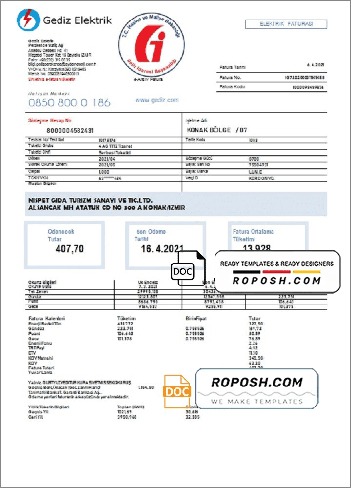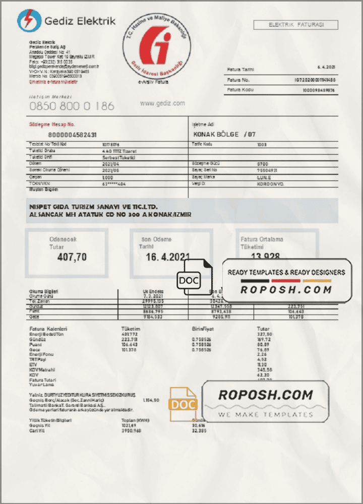 Turkey Gediz Elektrik Utility Bill Template – Editable Word Format