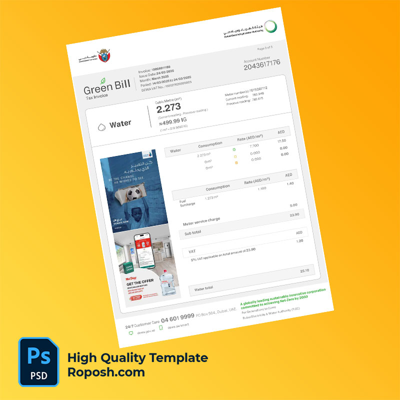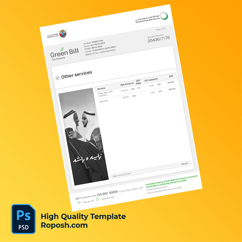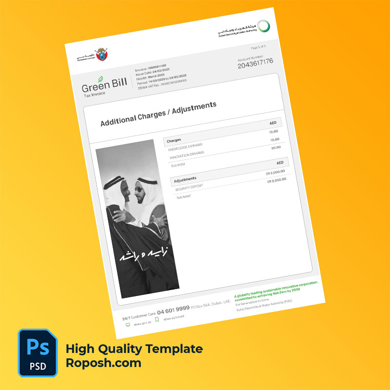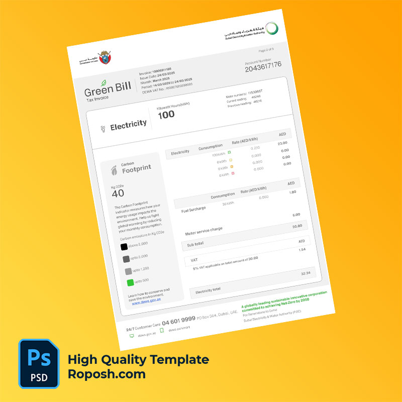 UAE Dubai Electricity & Water Authority Editable Electricity Bill Template in Word and PDF formats