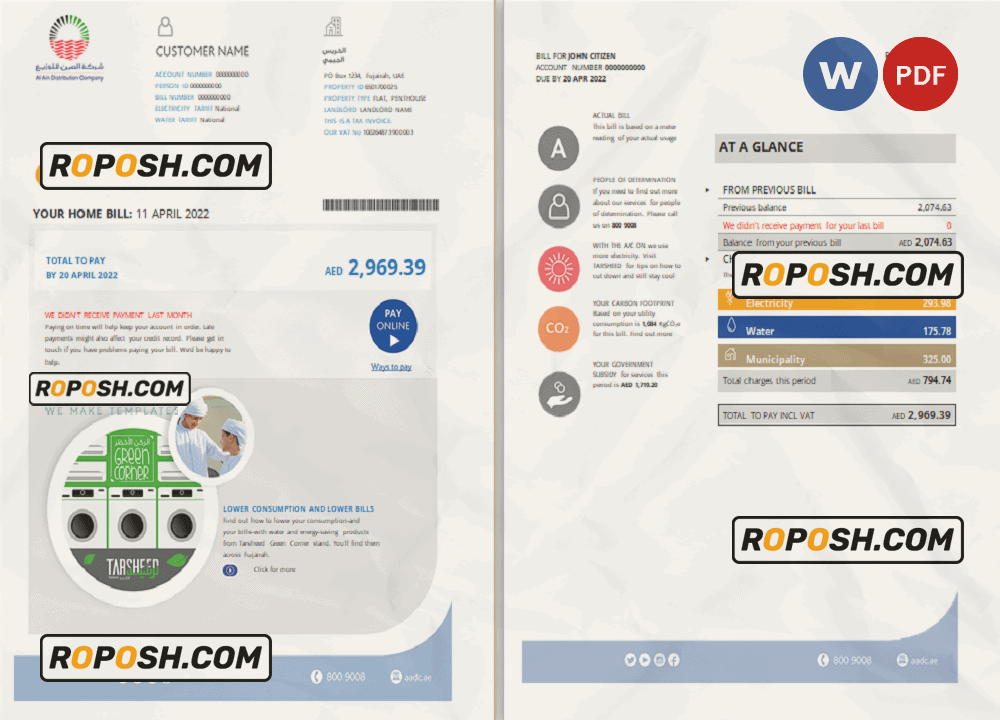 Get your blank UAE Ras Al Khaimah Al Ain Distribution Co. utility bill template now from our website, Roposh. Customize it with your own information to create a editable utility bill for proof of address. This is ideal if your original utility bill is expired, stolen, or unavailable. We also offer a variety of other templates, including passport PSD templates, ID card PSD templates, bank statement PSD templates, driver’s license PSD templates, and utility bill PSD templates.