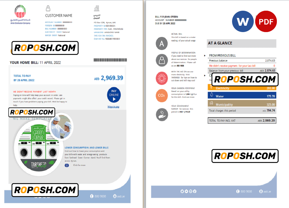 Get your blank UAE Sharjah Al Ain Distribution Co. utility bill template now from our website, Roposh. Customize it with your own information to create a copy for proof of address. Ideal for situations where your utility bill is expired, stolen, or unavailable. We also offer a variety of other templates, including passport PSD templates, ID card PSD templates, bank statement PSD templates, driver’s license PSD templates, and utility bill PSD templates.