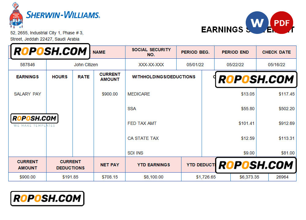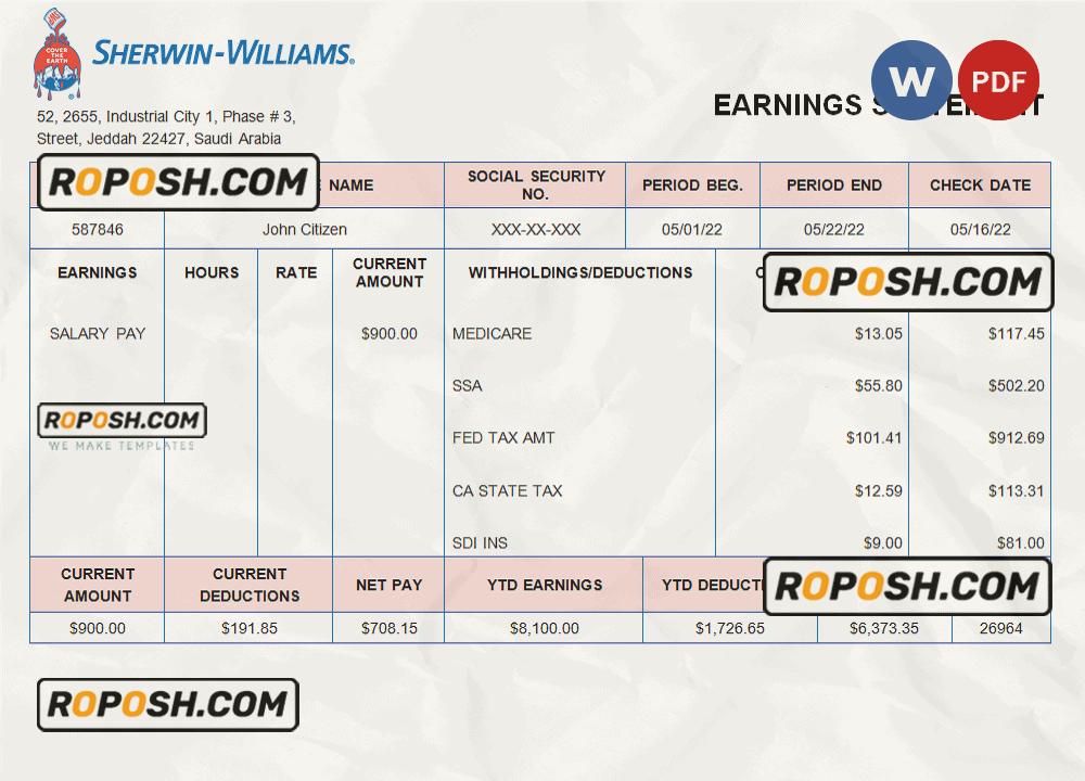 Grab now fully editable UAE Sherwin-Williams Paints paint manufacturing company pay stub Template from our website roposh and put your own info to create a copy of UAE Sherwin-Williams Paints paint manufacturing company pay stub template Word and ready your own novelty documents. It’ll be so beneficial if your pay stub is expired, stolen or not available. We also have word invoice template, ID Card psd template, Bank Statement psd template, drivers license psd template, Utility bill psd template & pay stub.