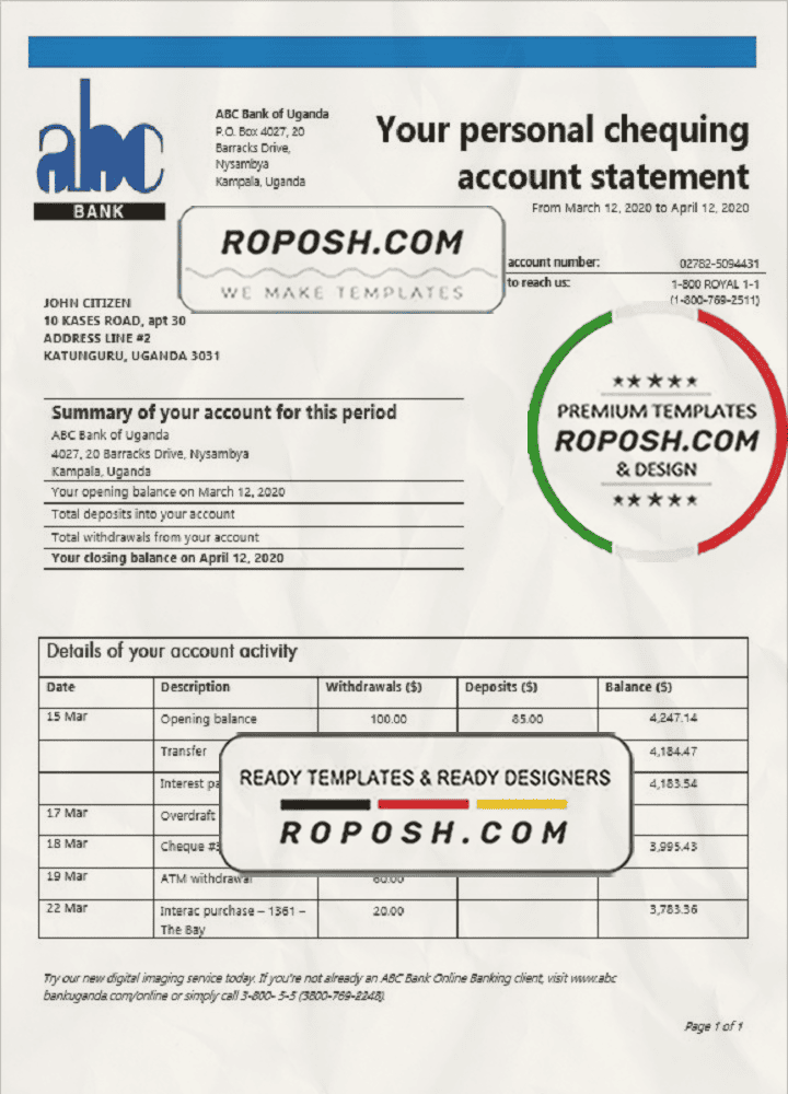 Grab now fully editable Uganda ABC Bank of Uganda proof of address bank statement Word Template from our website Roposh and put your own info to create Realistic Bank Statement Word template and ready your own novelty documents. It’ll be so beneficial if your Bank Statement is expired, stolen or not available.We also have editable credit card, ID Card psd template, Bank Statement psd template, drivers license psd template & printable editable blank utility bill template.