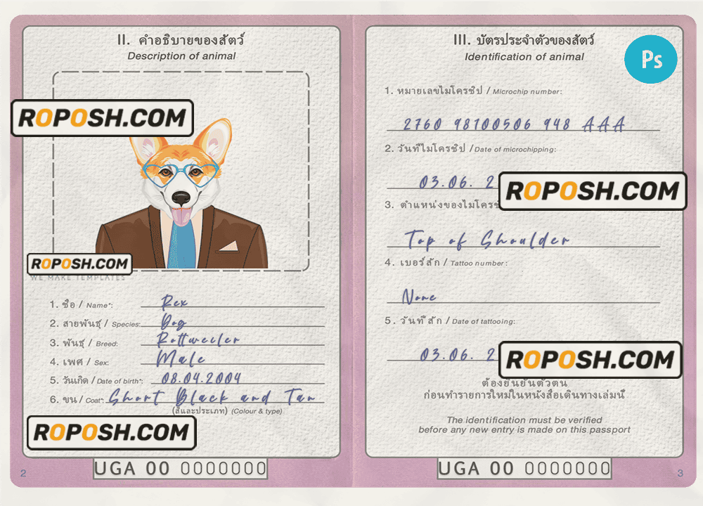 Uganda dog (animal, pet) passport PSD template, is your one-stop-shop for realistic and editable editable pet identity cards and passports. We specialize in creating high-quality, customizable editable pet passports and identity cards for dogs, cats, and other furry friends.
