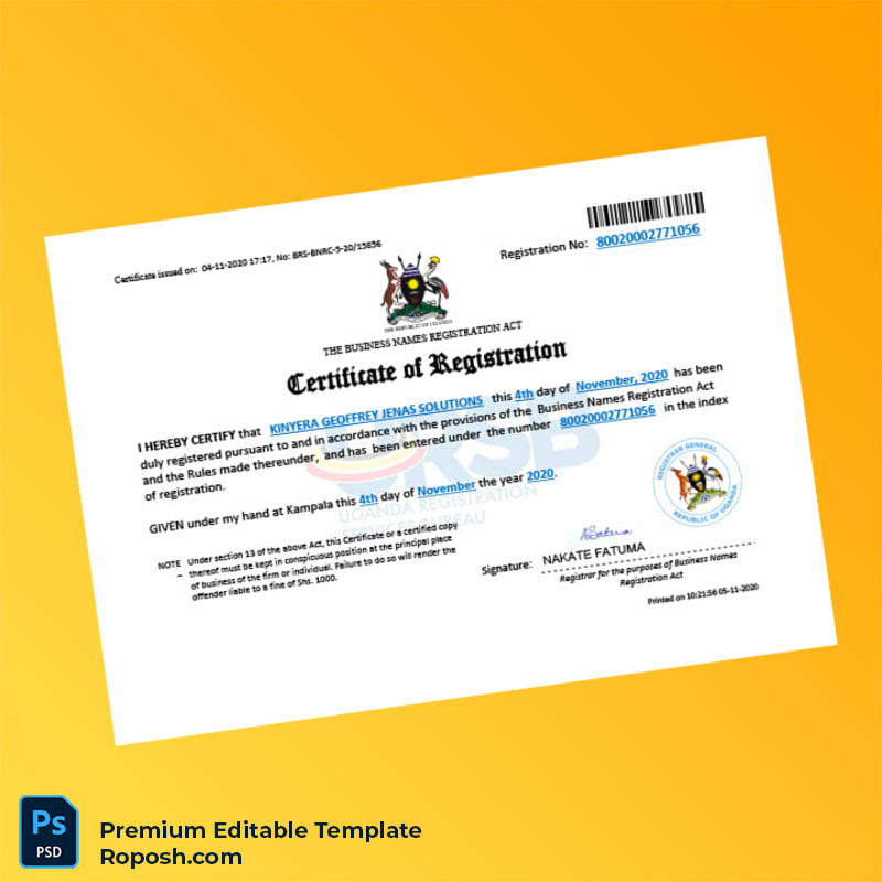 Uganda Registrar of Business Names Business Name Registration Certificate Editable Word & PDF Template 3 page