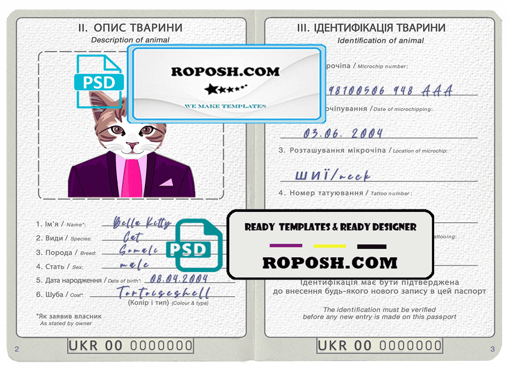 Ukraine cat (animal, pet) passport PSD template, is your one-stop-shop for realistic and editable editable pet identity cards and passports. We specialize in creating high-quality, customizable editable pet passports and identity cards for dogs, cats, and other furry friends.