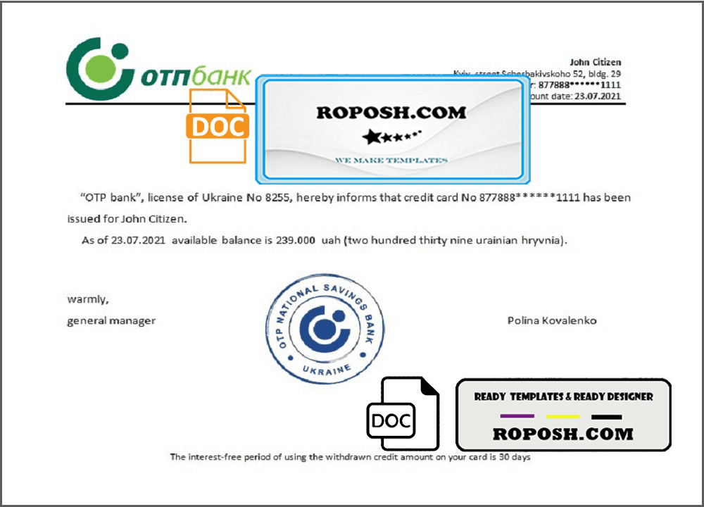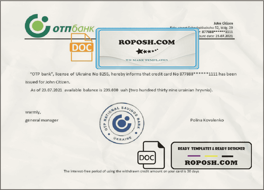 Ukraine OTP bank account balance reference letter template in Word and PDF format