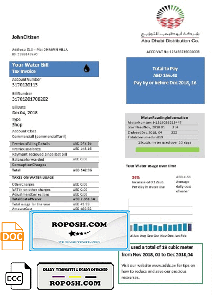 Download our fully editable United Arab Emirates Abu Dhabi Distribution water utility bill template in Word format. This high-quality, customizable template is layer-based and includes all necessary fonts. Easily modify the template to include any name, address, license number, ID number, birth date, height, weight, expiration date, and more. Perfect for creating a editable utility bill for proof of address. Ensure your documents are up-to-date and avoid account suspensions with our premium template.
