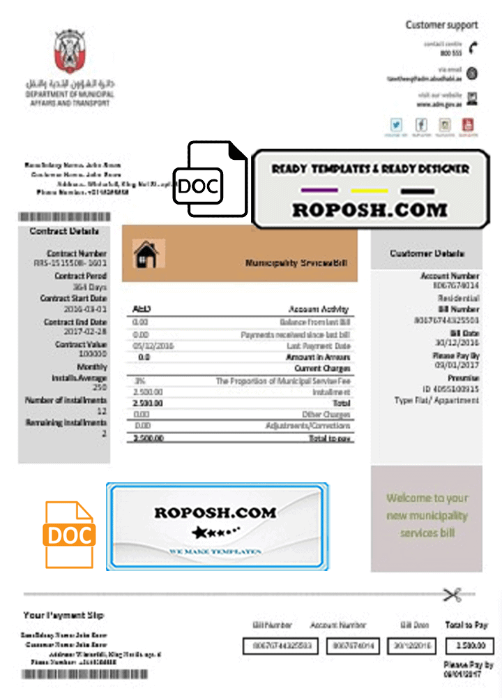 Get your blank United Arab Emirates Abu Dhabi Municipality Service Utility Bill Template from Roposh. Customize it to create a editable utility bill for proof of address. Perfect for when your utility bill is expired, stolen, or unavailable. We also offer a wide range of templates including passport PSD templates, ID card PSD templates, bank statement PSD templates, driver’s license PSD templates, and more.