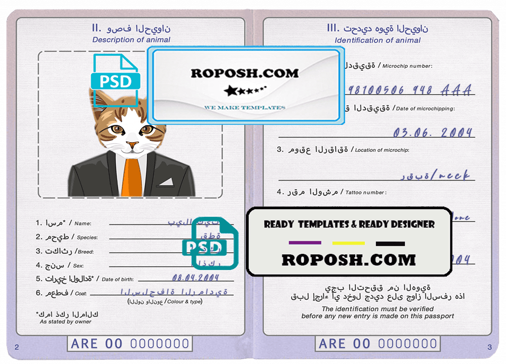 United Arab Emirates cat (animal, pet) passport PSD template, is designed to look and feel like real documents. Each template is carefully crafted to include all the necessary details, such as your pet’s name, breed, date of birth, and microchip information. With our fillable cat or dog passport templates, you can quickly and easily create a editable pet passport that meets all the requirements for international travel.