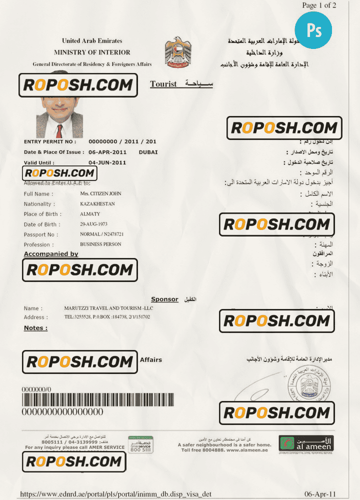 UNITED ARAB EMIRATES electronic travel visa template psd. Buy Customizable Travel Visa Template with high quality and enjoy its unique features such as easy to customize, Layer based, fonts included sample. you can edit this template and put any name, address, license number, Id number, birth date, height, weight, expire date, change photos etc. This Photoshop template is a layer based psd file and it’s easy to Editing.To modify this photoshop template file you will need a Photo editing software such as Adobe Photoshop No need to be expert on editing software like adobe Photoshop. However, You just have to basic knowledge on adobe photoshop, to edit this template. Never used low quality template. Your account may be suspended. Also, if you’re looking for an editable SSN template, Roposh is by your side so you can get it easily and even for free.