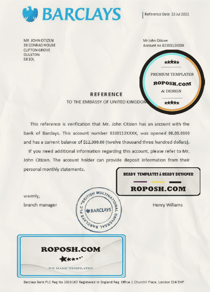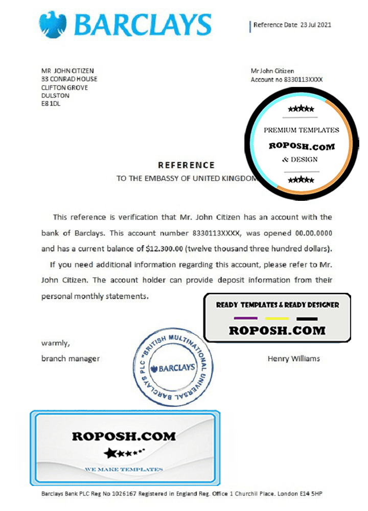 United Kingdom Barclays bank reference letter template in Word and PDF format offer high-quality customizable bank reference form template in PSD and Word format, allowing you to easily fill in your personal details and make them look authentic. Our templates are perfect for online account verification, research, presentation, or work.