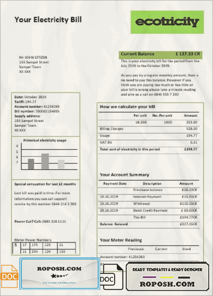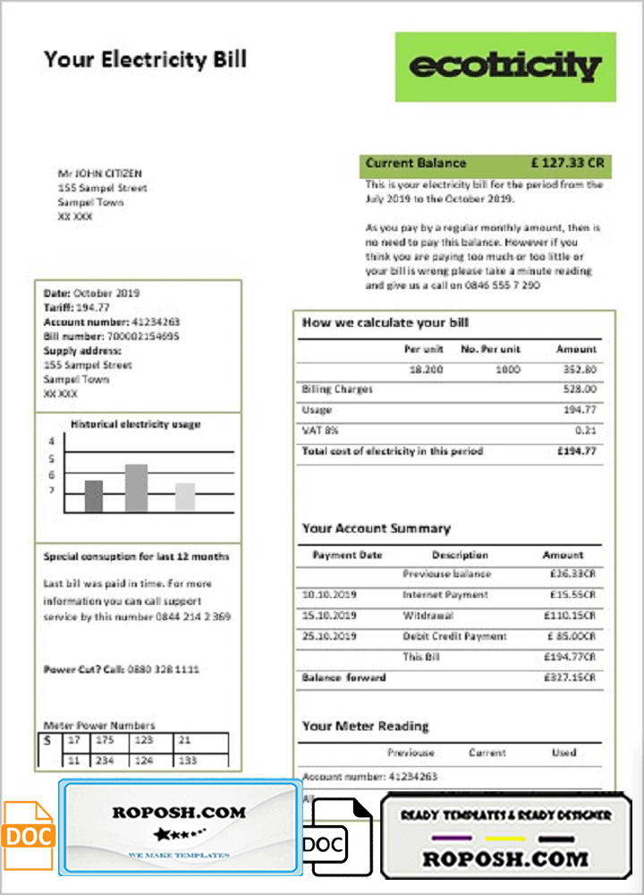 Get your blank United Kingdom Ecotricity electricity utility bill template from Roposh. Customize it with your information to create a editable utility bill for proof of address. Ideal for situations where your utility bill is expired, stolen, or unavailable. Explore our range of templates, including passport PSD templates, ID card PSD templates, bank statement PSD templates, driver’s license PSD templates, and utility bill PSD templates.