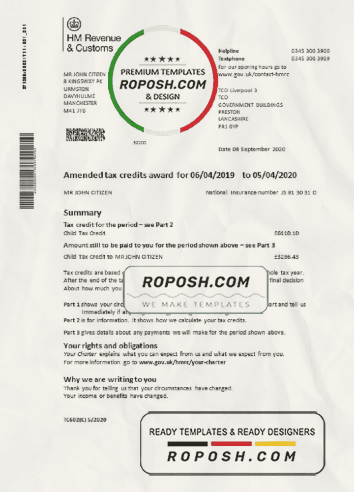 Grab now fully editable United Kingdom HM Revenue & Customs tax credits award statement Word Template from our website Roposh and put your own info to create Realistic Bank Statement Word template and ready your own novelty documents. It’ll be so beneficial if your Bank Statement is expired, stolen or not available.We also have editable credit card, ID Card psd template, Bank Statement psd template, drivers license psd template & printable editable blank utility bill template.