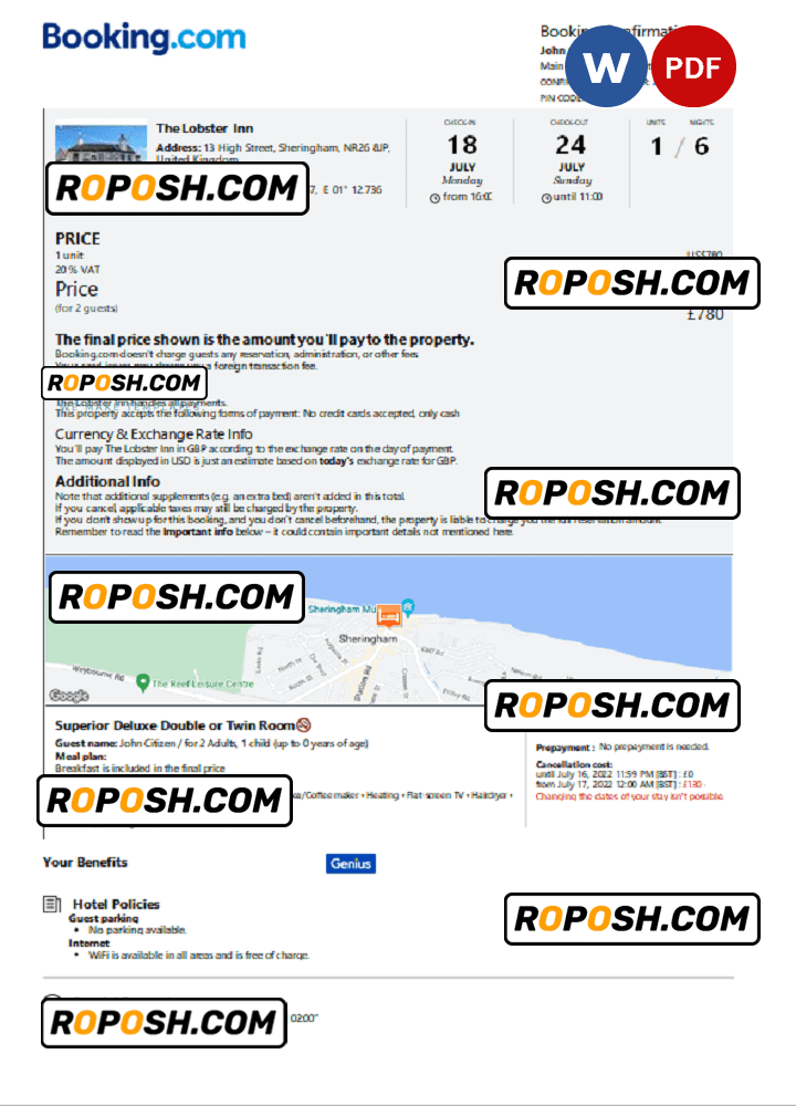 This Blank United Kingdom hotel booking confirmation PDF Template is perfect for a variety of uses, such as Visa applications, proof of accommodation, showing your expenses, and more. You can even use it to create realistic copies of your credit card for novelty documents. We have a variety of other templates available, including passport templates, ID card templates, reciept template, and more.