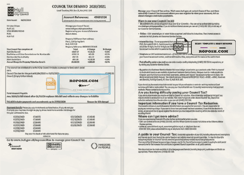 Get your hands on a blank United Kingdom Hull City Council utility bill template from Roposh. Customize it with your own information to create a convincing editable utility bill for proof of address. Ideal for situations where your utility bill is expired, stolen, or unavailable. We also offer a variety of other templates, including passport PSD templates, ID card PSD templates, bank statement PSD templates, driver’s license PSD templates, and utility bill PSD templates.