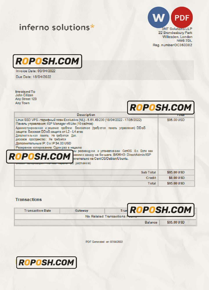 Featuring a wide range of templates from all over the world, the United Kingdom Inferno Solutions invoice Word Template is fully customizable, and included fonts. Edit all relevant details, such as name, photo, signature, barcodes, and holograms, to create a realistic, high-quality editable invoice template.