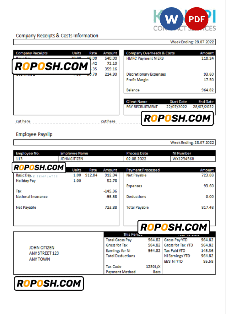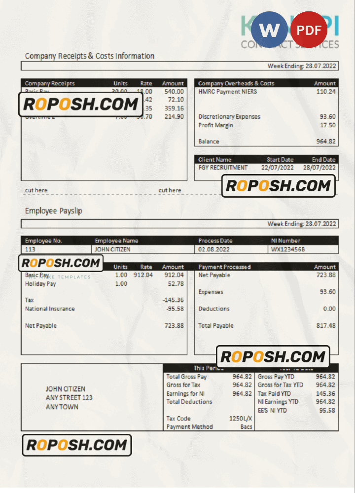 Blank United Kingdom Kanopi Contract Services payroll company pay stub Word and Pdf Template use for :