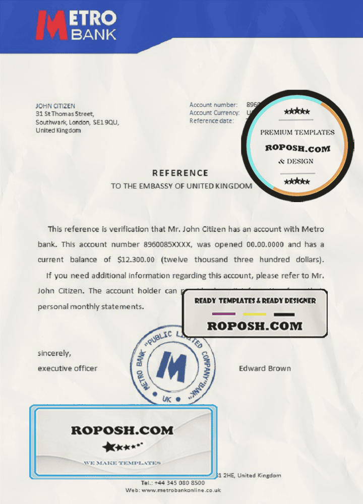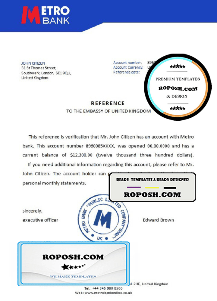 United Kingdom Metro bank reference letter template in Word and PDF format