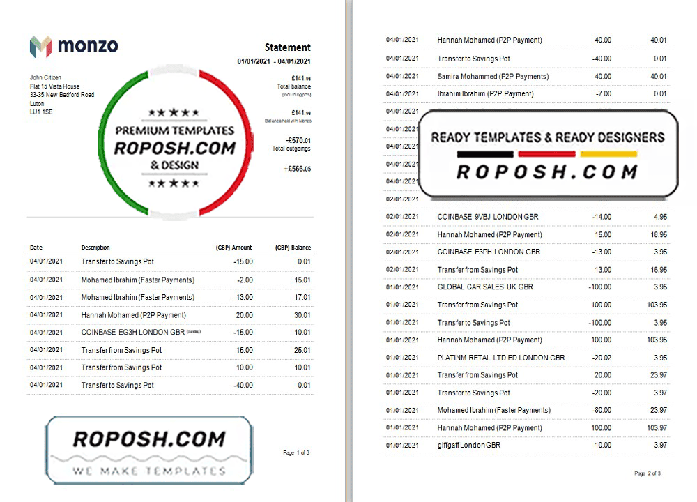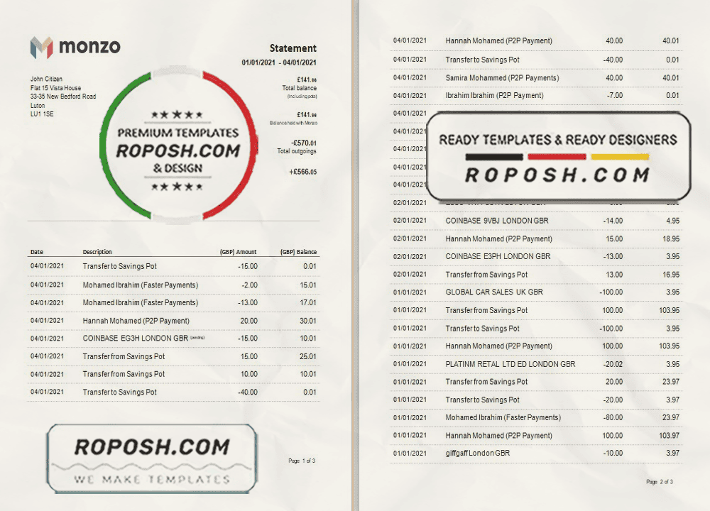 Get your fully editable United Kingdom Monzo Bank Statement Excel Template from our website Roposh and customize it with your own information to create a realistic bank statement. This is especially useful if your bank statement is expired, stolen, or unavailable. We also offer editable credit card templates, ID card templates, bank statement PSD templates, driver’s license PSD templates, and printable editable blank utility bill templates.