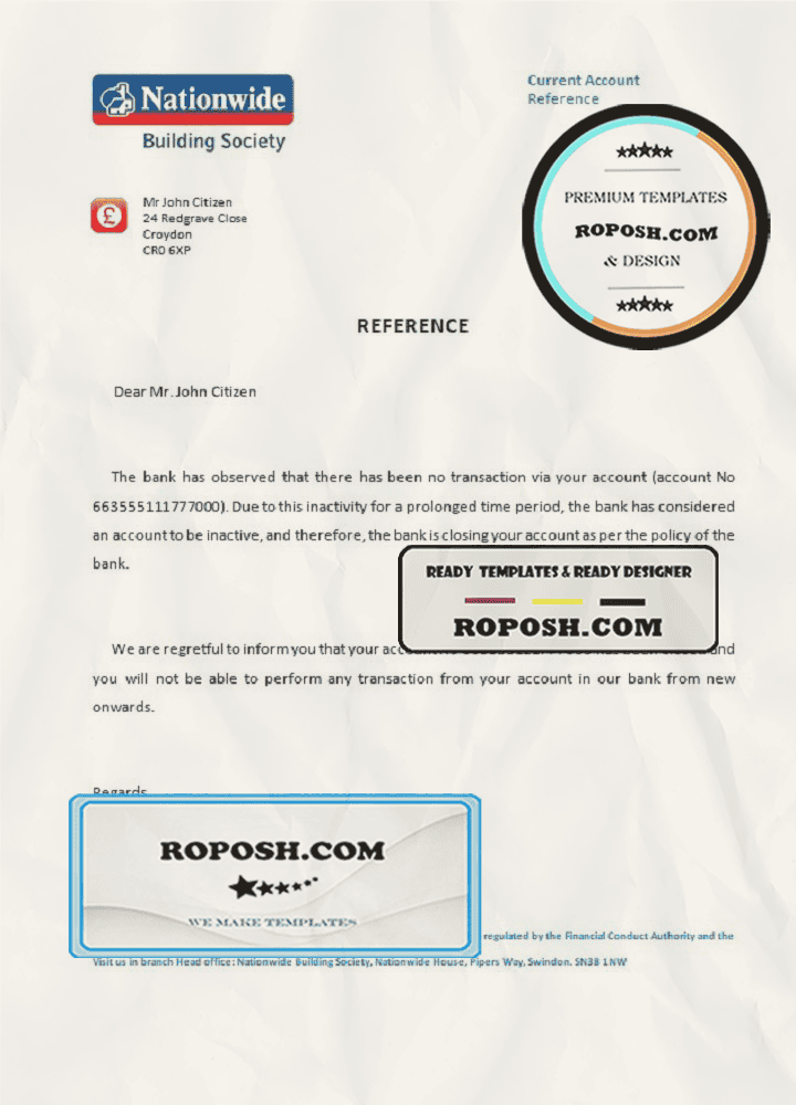 United Kingdom Nationwide bank account closure reference letter template in Word and PDF format