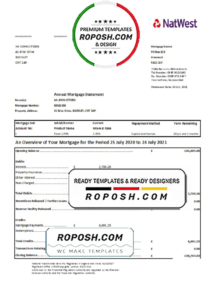 United Kingdom NatWest bank statement template in .xls and .pdf file format