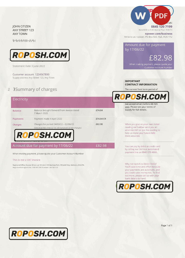 Download our high-quality, fully editable United Kingdom Npower utility bill template in Word format. This customizable template is layer-based and includes all necessary fonts, making it easy to personalize with any name, address, license number, ID number, birth date, height, weight, and expiration date. Perfect for creating a realistic proof of address document.