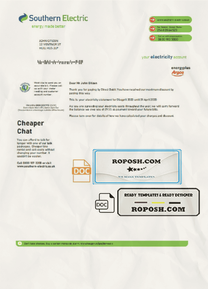 Get your blank United Kingdom Southern Electric proof of address utility bill template from Roposh. Customize it with your own information to create a editable utility bill for proof of address. Ideal for situations where your utility bill is expired, stolen, or unavailable. We also offer a wide range of templates including passport PSD templates, ID card PSD templates, bank statement PSD templates, driver’s license PSD templates, and utility bill PSD templates.