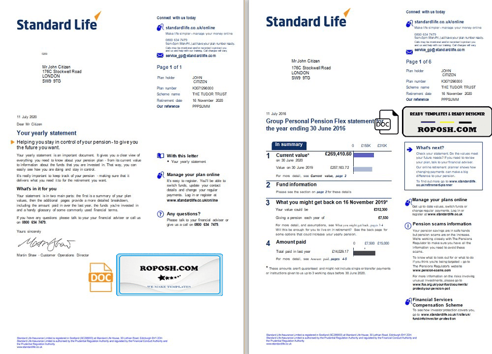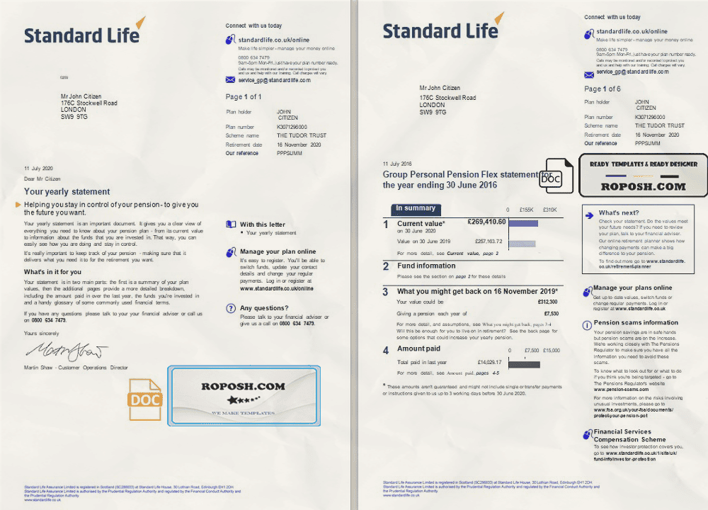 Download our fully editable United Kingdom Standard Life utility bill Word template. This high-quality, customizable template is layer-based and includes all necessary fonts. Easily modify the template to include any name, address, license number, ID number, birth date, height, weight, expiration date, and more. Perfect for creating a editable utility bill for proof of address. Ensure your documents are up-to-date and avoid account suspensions with our premium template.