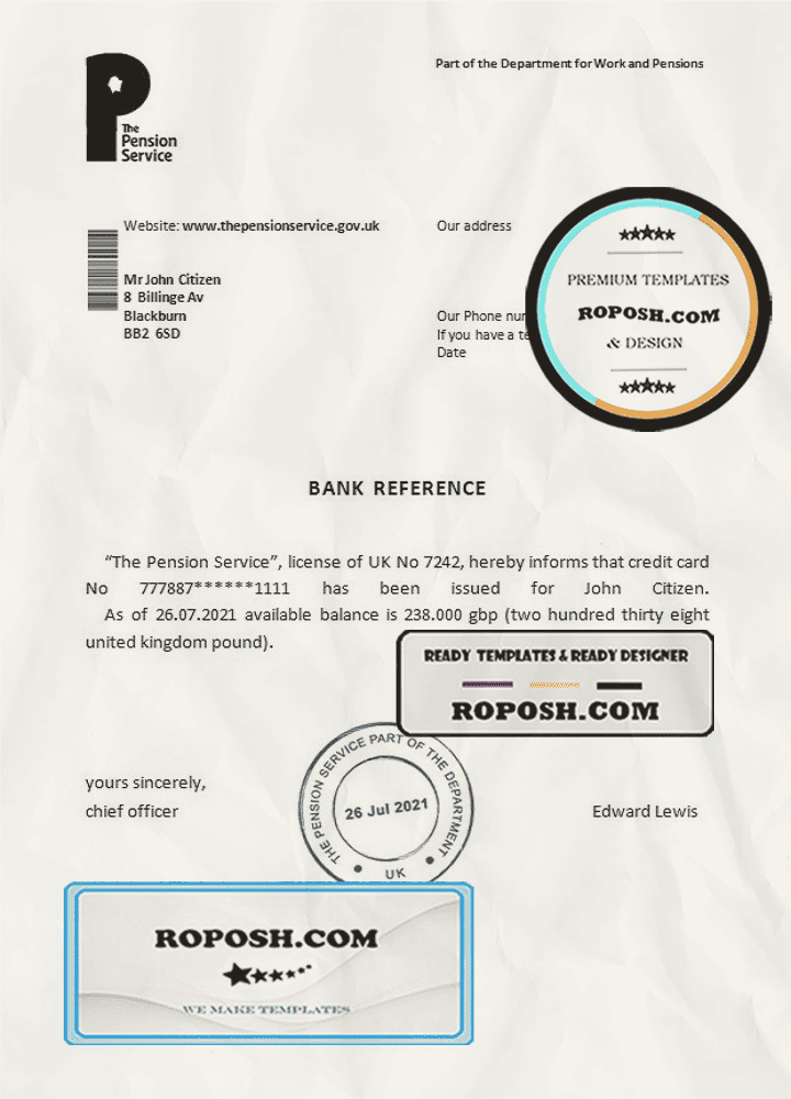 United Kingdom The Pension Service bank reference letter template in Word and PDF format