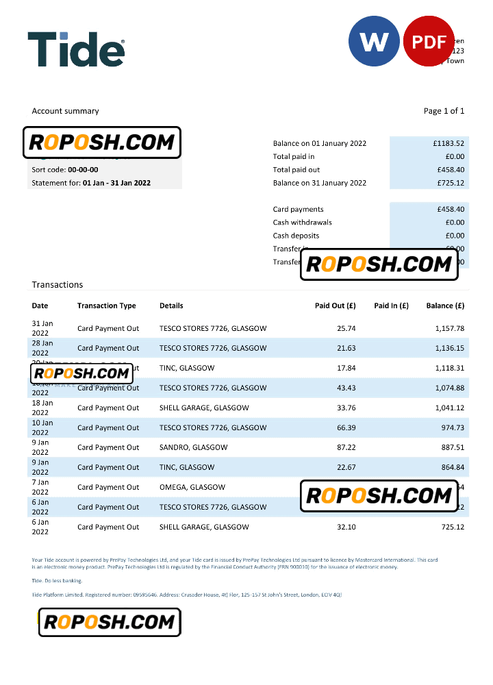 Get your fully editable United Kingdom Tide Bank Statement Word Template from Roposh and customize it with your own information to create realistic bank statements. This is especially useful if your bank statement is expired, stolen, or unavailable. We also offer editable credit card templates, ID card PSD templates, bank statement PSD templates, driver’s license PSD templates, and printable editable blank utility bill templates.