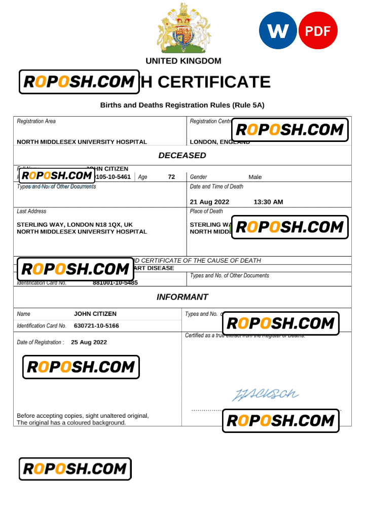 Don’t let complicated procedures bog you down, purchase our exceptional editable death certificate now. Trust us at roposh to deliver the best counterfeit document in the market so that you and your loved ones can bounce back from the loss.
