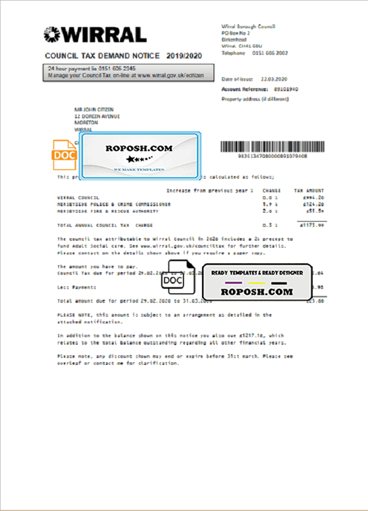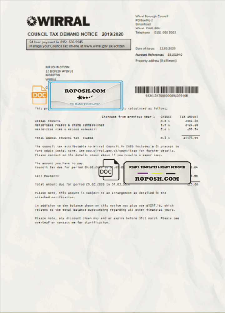 Get your blank United Kingdom Wirral Council Tax Utility Bill Template from Roposh. Customize it with your information to create a realistic proof of address document. Ideal for situations where your utility bill is expired, stolen, or unavailable. Explore our other templates, including passport PSD templates, ID card PSD templates, bank statement PSD templates, driver’s license PSD templates, and utility bill PSD templates.