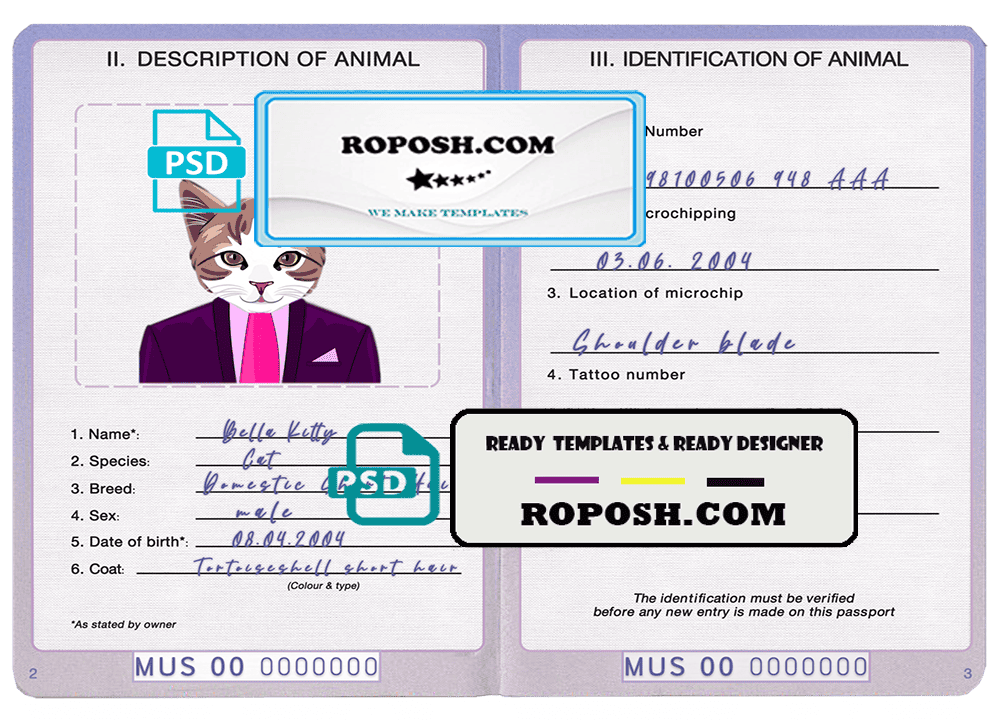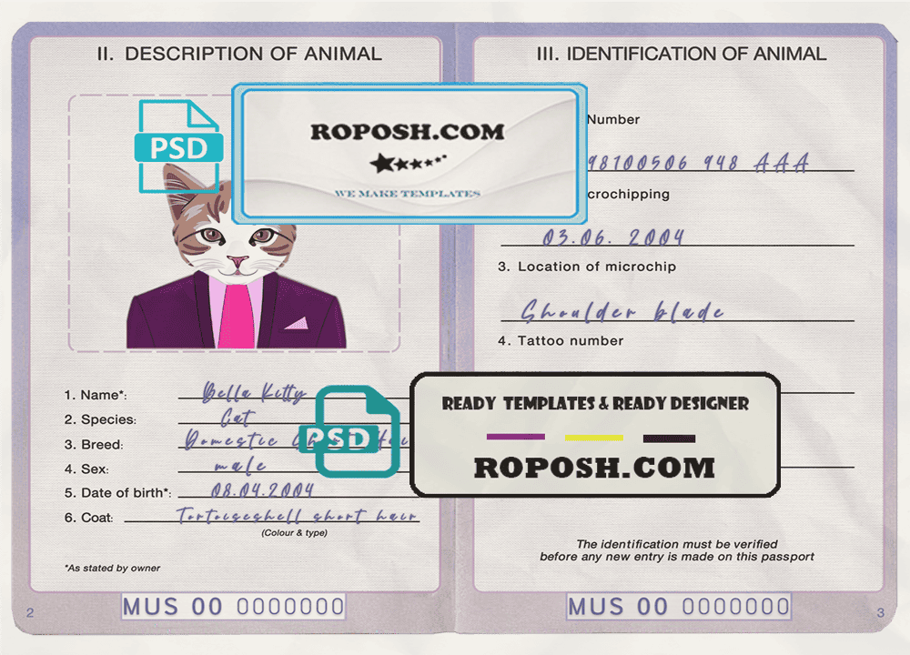 United States of America cat (animal, pet) passport PSD template, is designed to look and feel like real documents. Each template is carefully crafted to include all the necessary details, such as your pet’s name, breed, date of birth, and microchip information. With our fillable cat or dog passport templates, you can quickly and easily create a editable pet passport that meets all the requirements for international travel.