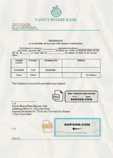 Grab now fully editable unity future bank universal multipurpose bank account reference Word Template from our website Roposh and put your own info to create Realistic Bank Statement Word template and ready your own novelty documents. It’ll be so beneficial if your Bank Statement is expired, stolen or not available. We also have passport psd template, ID Card psd template, Bank Statement psd template, drivers license psd template & Utility bill psd template
