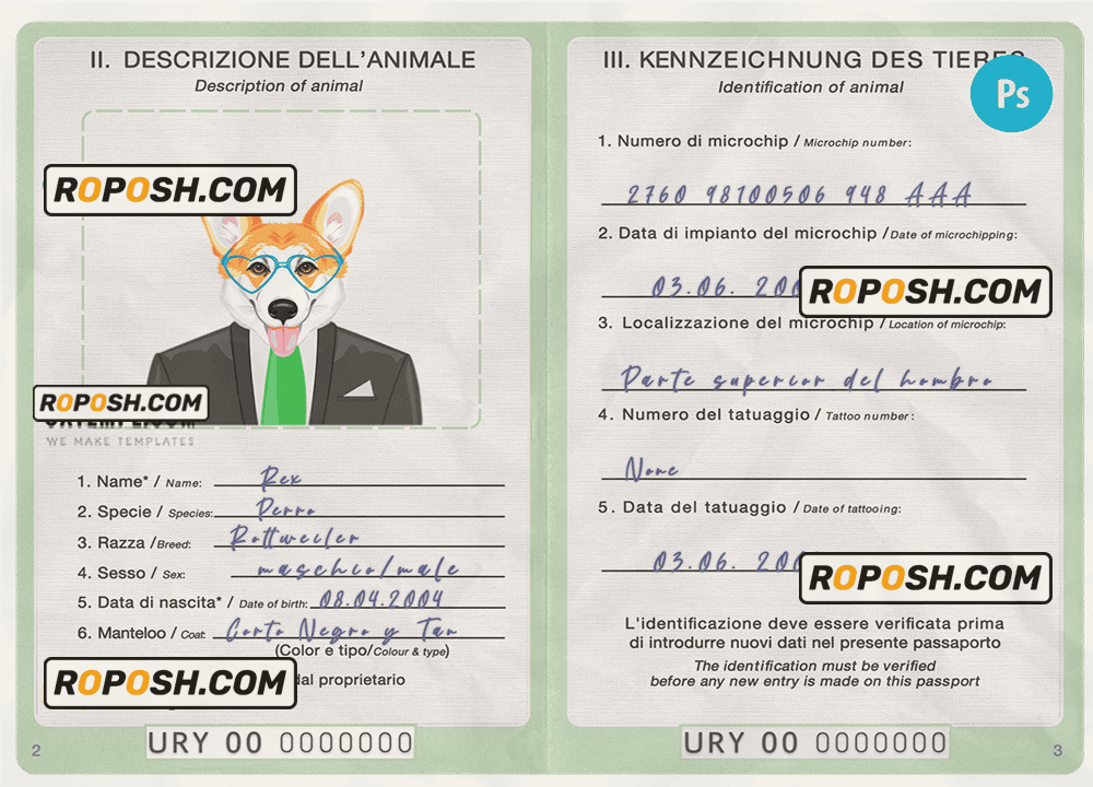 Uruguay dog (animal, pet) passport PSD template, is designed to look and feel like real documents. Each template is carefully crafted to include all the necessary details, such as your pet’s name, breed, date of birth, and microchip information. With our fillable cat or dog passport templates, you can quickly and easily create a editable pet passport that meets all the requirements for international travel.