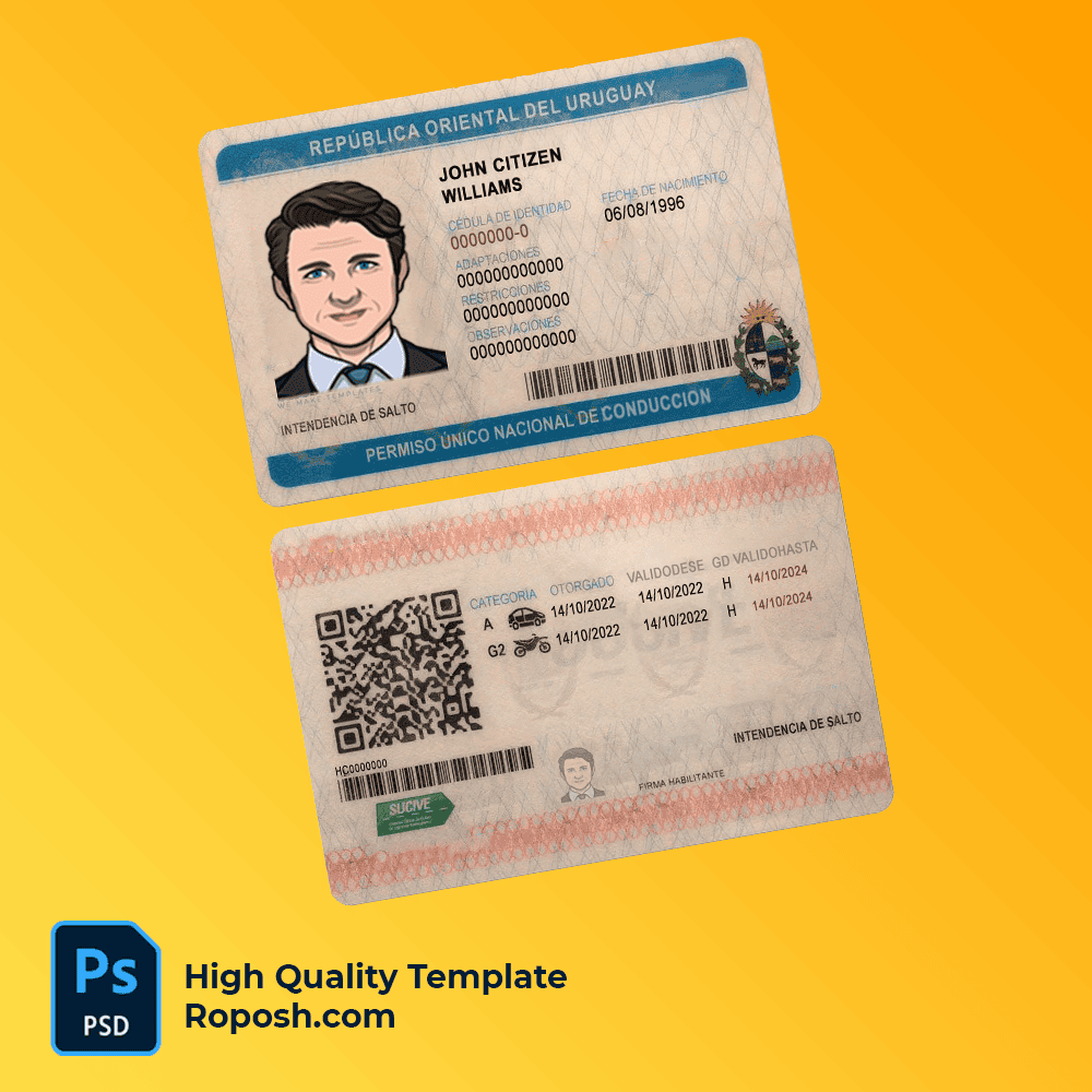 - Our Uruguay driver license PSD template is layered, making it easy to edit using Adobe Photoshop.
